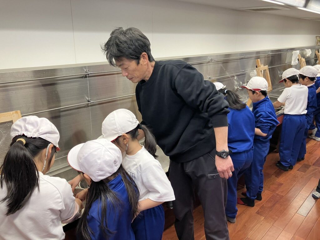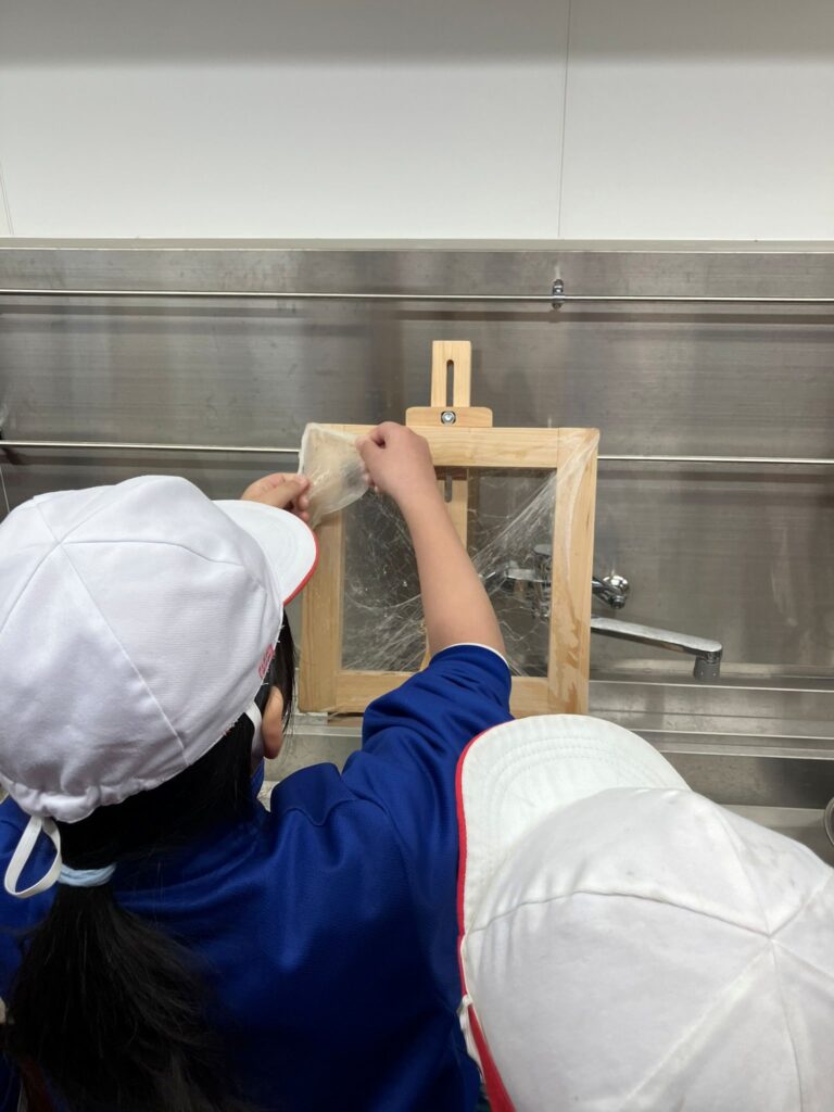 上田市立東小学校2年1組の皆さんが真綿作り体験に来てくれました